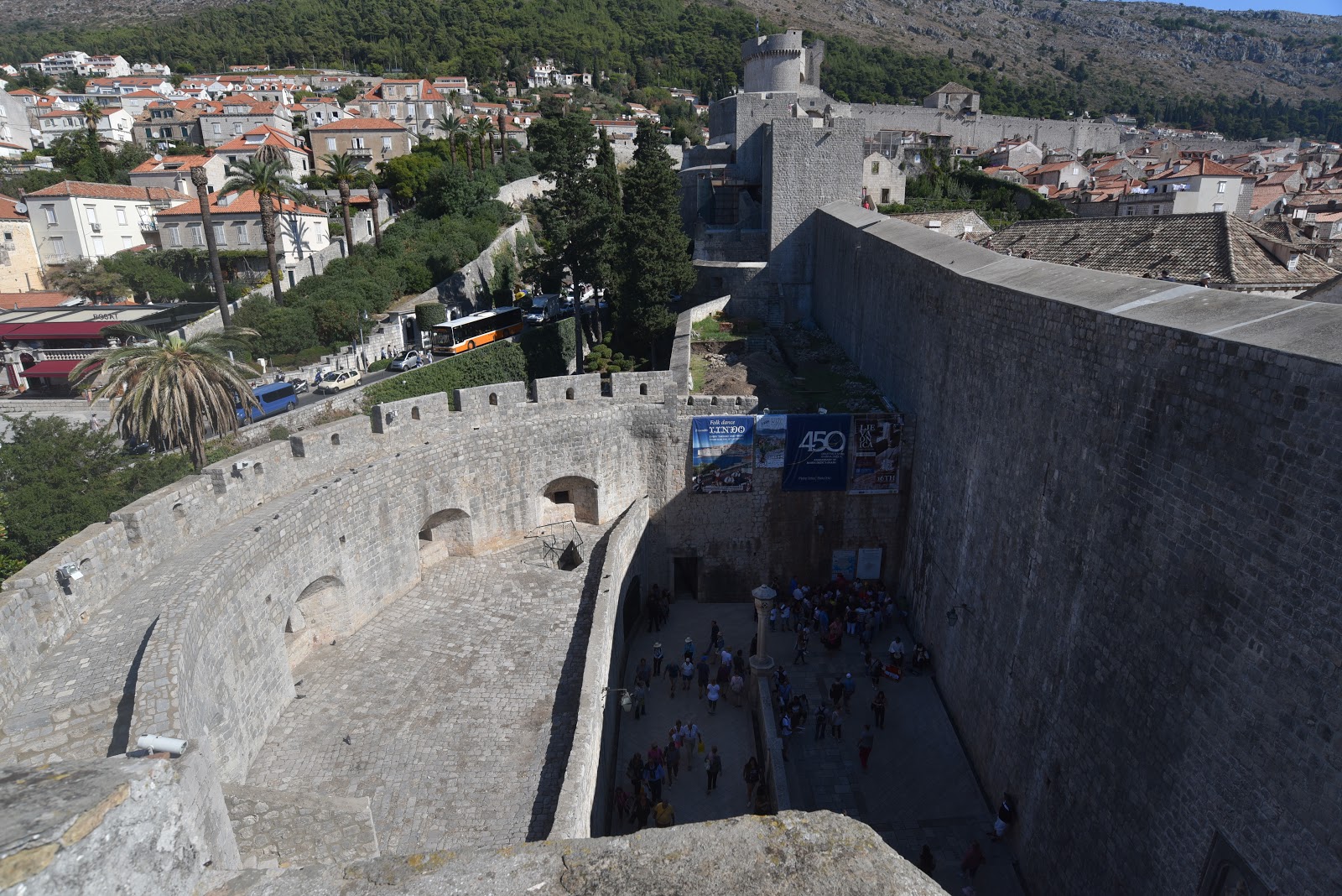We were easily enticed to climb up to walk atop the high ancient stone walls, rising from the sea, protectively thick & thus occasionally wide enough to become small streets with terraces … places for restaurants & bars offering views on one side out to the water or down the other side onto the tile roofs of the old city.