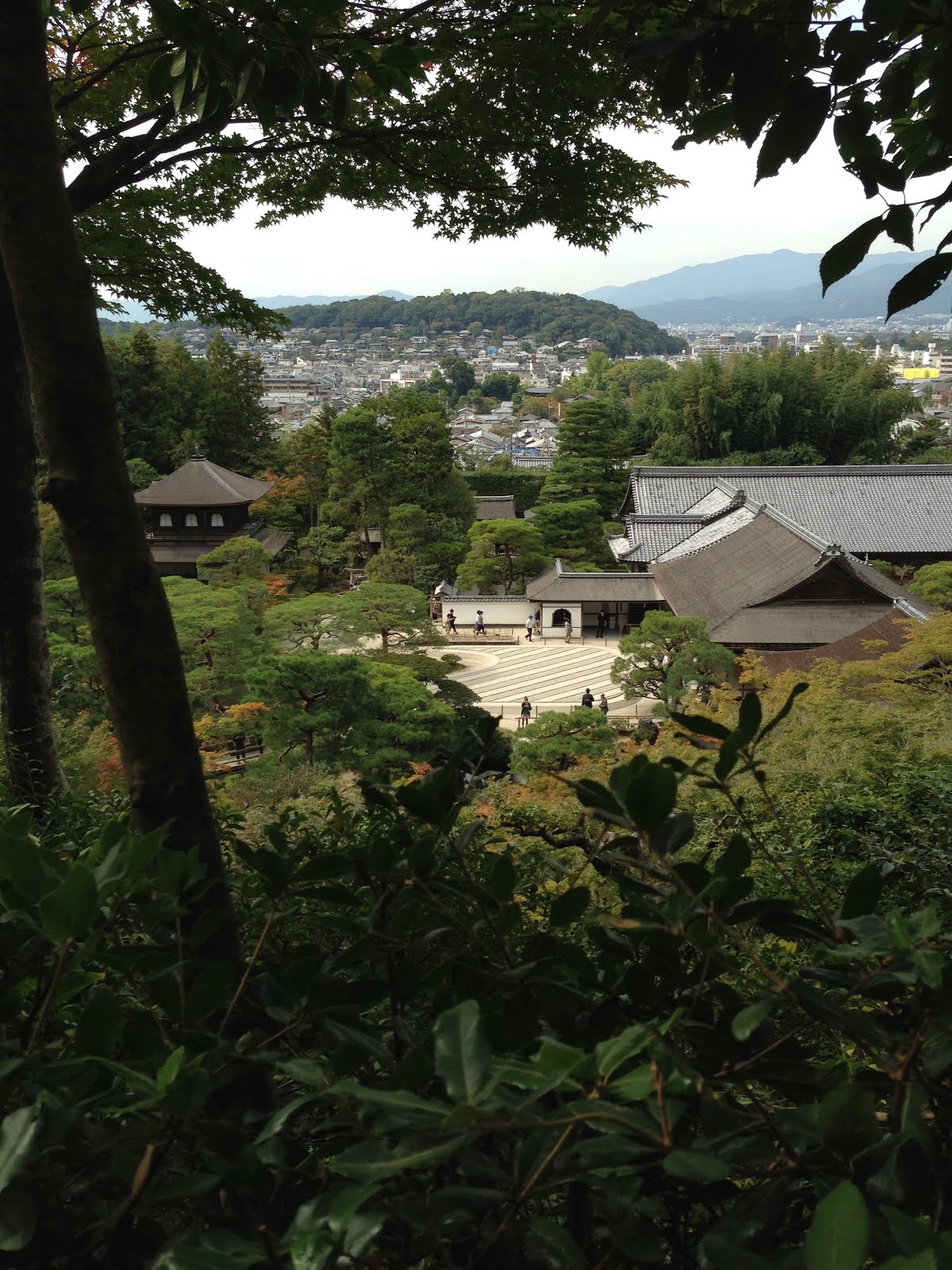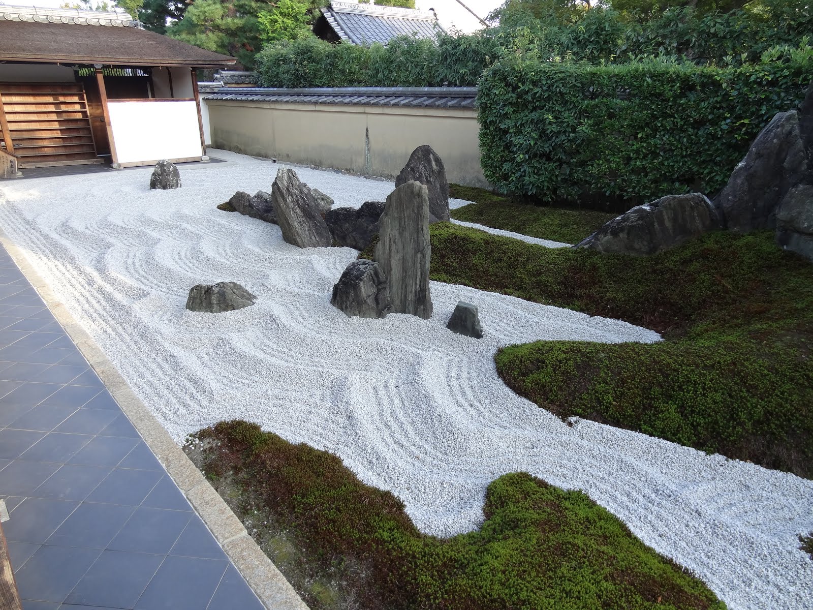 There is a pair of famous temples on the eastern & western sides of Kyoto, close to the bordering mountains… one Silver & the other Golden… both having large gardens… in opposing styles. The Silver Temple never got its metallic treatment… the dark two-story building just to the right of sand cone is the temple. It’s gardens are the attraction, beginning with this sand garden featuring a blunt conical shape representing Mount Fuji… seemingly as symbolic volcano.