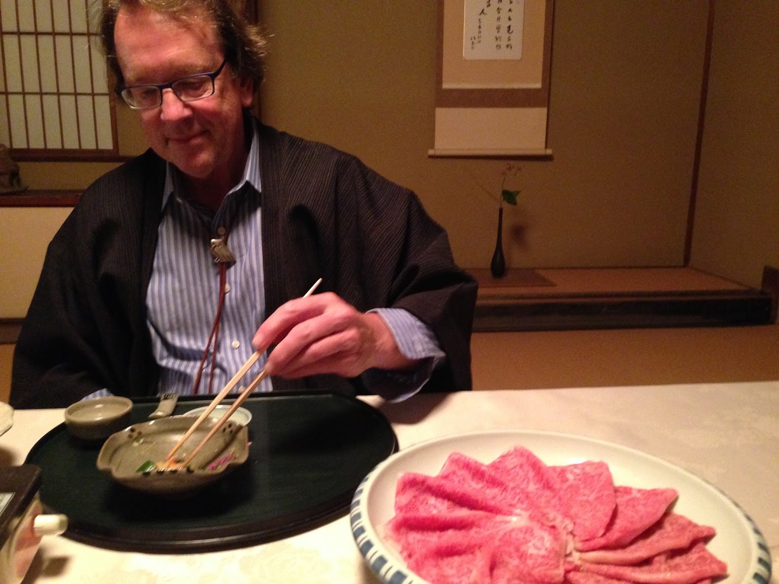 Returning to Tokyo for one last night before flying home, we met friends of Terry-san for our fourth meal of the fantastic Kobe beef… this time as Sukiyaki… seared in an iron pot with a sauce. We were given the richest eggs