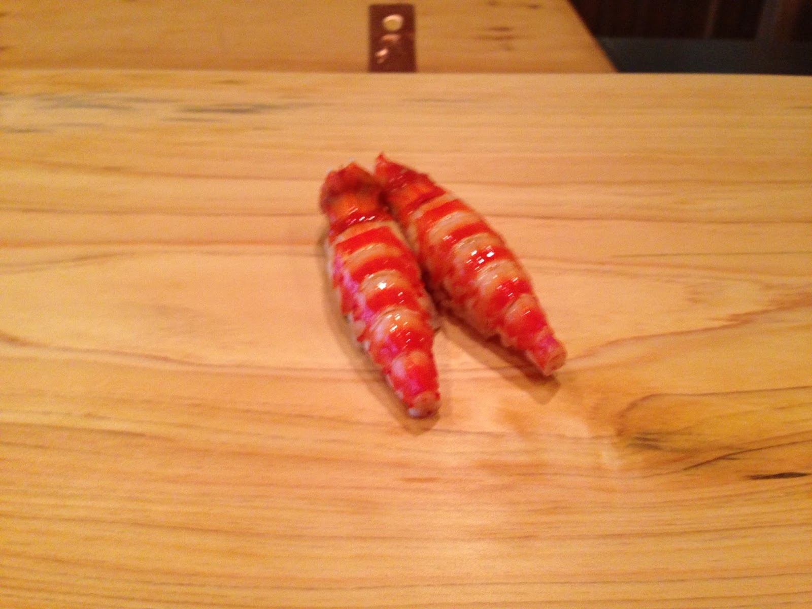 Carefully lifting a covered tin containing a single fillet of a precious fish from a refrigerator beneath, he artfully sliced two thin slices Then, wiping both the top of the lid & the bottom of that container, replaced it. Deftly he sculpted a lump of rice tickled with a bit of wasabi & topped with a slice of the fish, laid side by side to be picked up as a pair to be gently brushed with a glaze of soy sauce before being presented to us. We learned later we were expected to pick them up with our own fingers instead of the chopsticks we used.