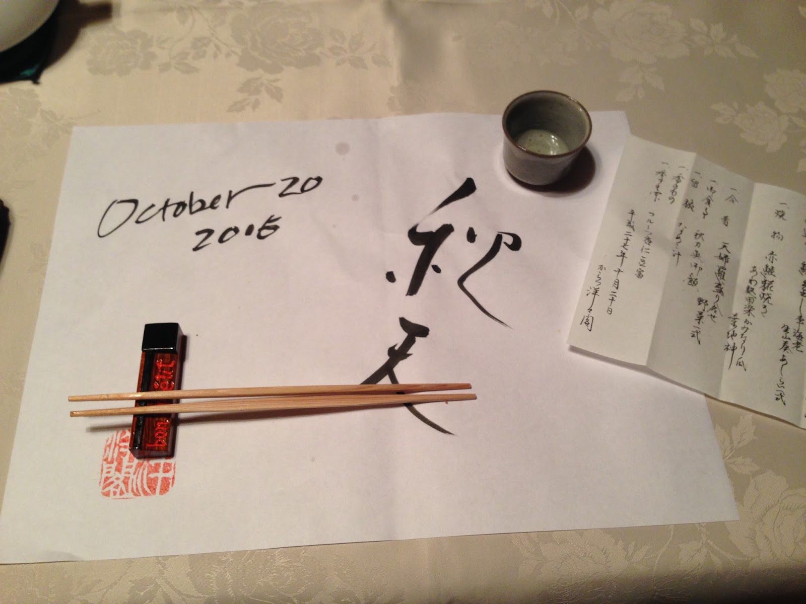 Our last meal at Yoyokaku featured hand-made calligraphic place mats by our host’s wife…
