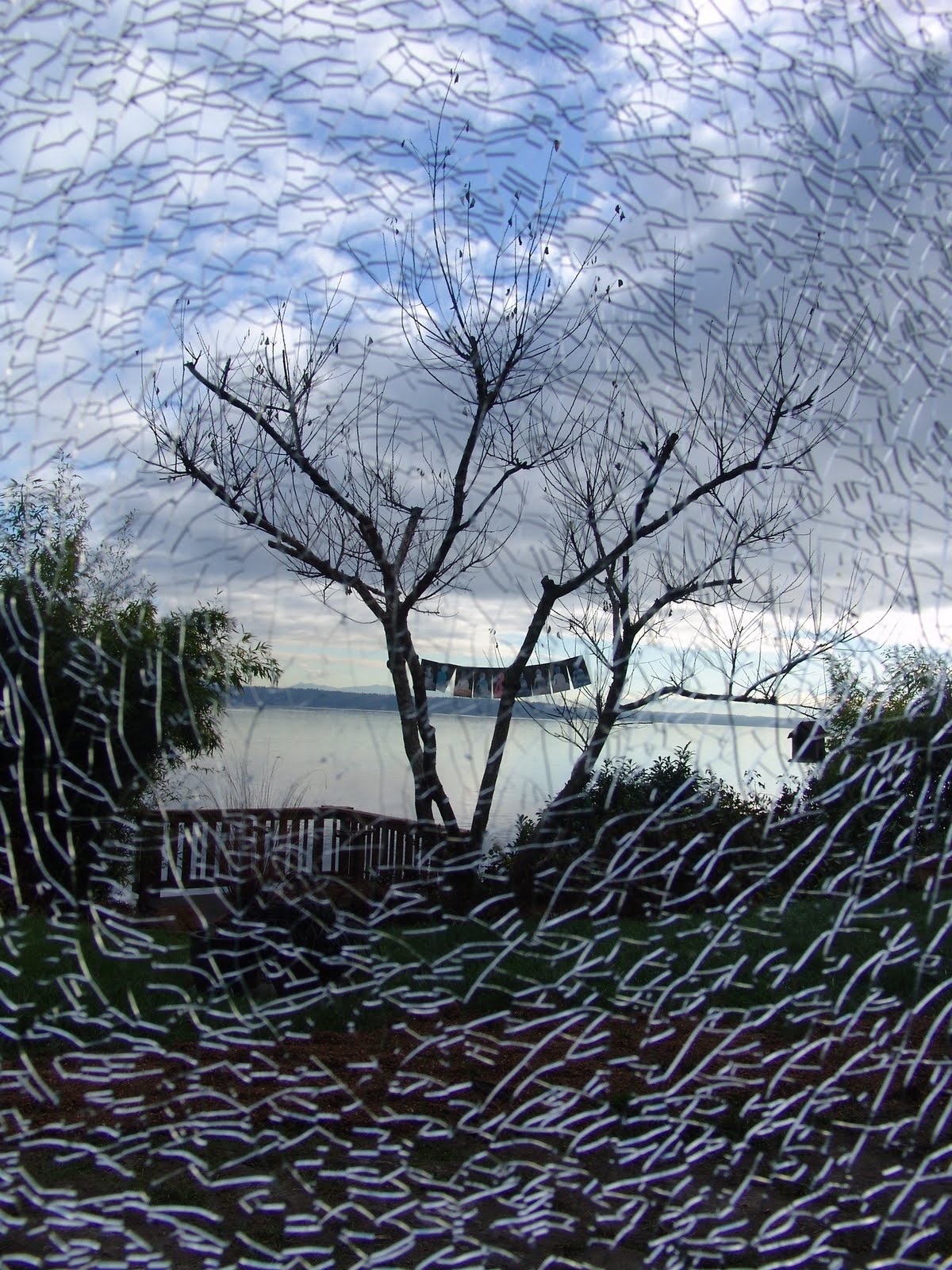 An accident occurring just two days before the Open Studio saw the door, which would soon need to welcome our visitors, broken into a million-pieced jigsaw puzzle… giving my camera’s eye some wild visuals… while being accompanied by a curious soundtrack of crackling pings & tinkles which went on for several hours as the tempered glass continued its slow disintegration. It held in its suspension of gravity for most of a day before falling into a fine mess needing careful attention toward clean-up!