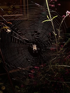 I wrote last year about spider webs but this year my camera has been seduced anew. Being so subtle as to be invisible in some light while another angle brings them into stunning reflection against dark background… they are deliciously elusive to capture with the lens. Finding the vantage point with good back-light against a low-keyed background, or shooting at night to catch that deeper contrast are interesting problems to solve. Raindrops included might be photographically trite but that’s probably because they too are such a fine teaching tool!