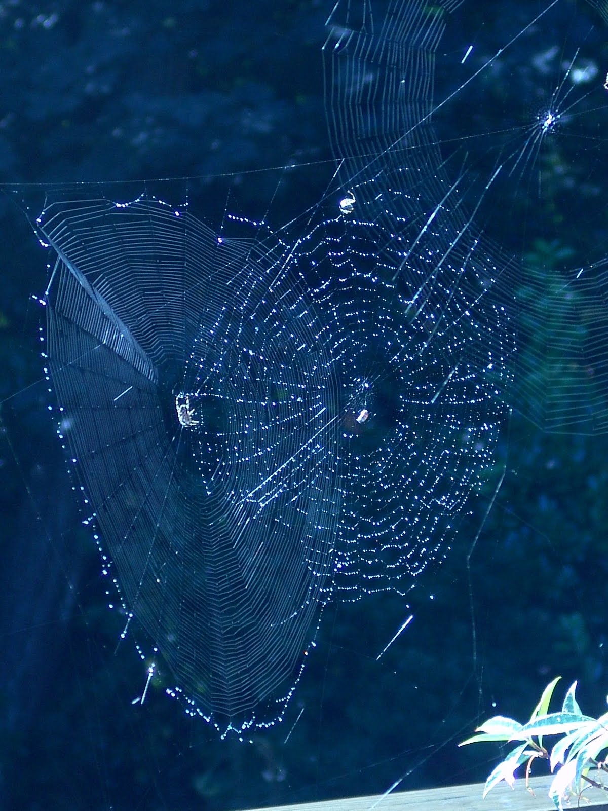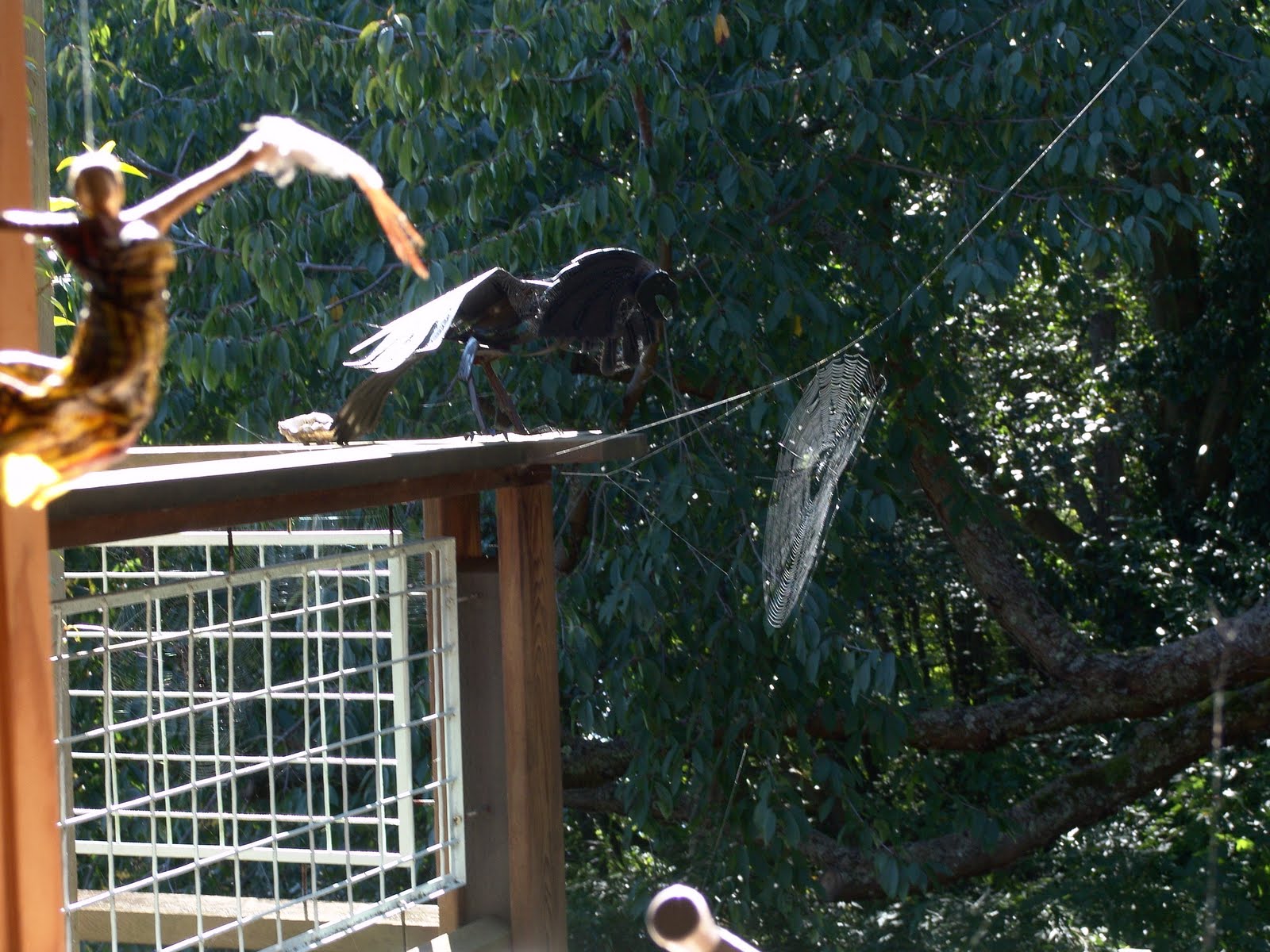 This shot attempted to catch several versions of flight seen through our bathroom window… a papier-mache figure with feather wings inside & an iron crow sculpture out on the deck rail, with a web built floating on the breeze, it’s real flight spans some 12 foot distance.