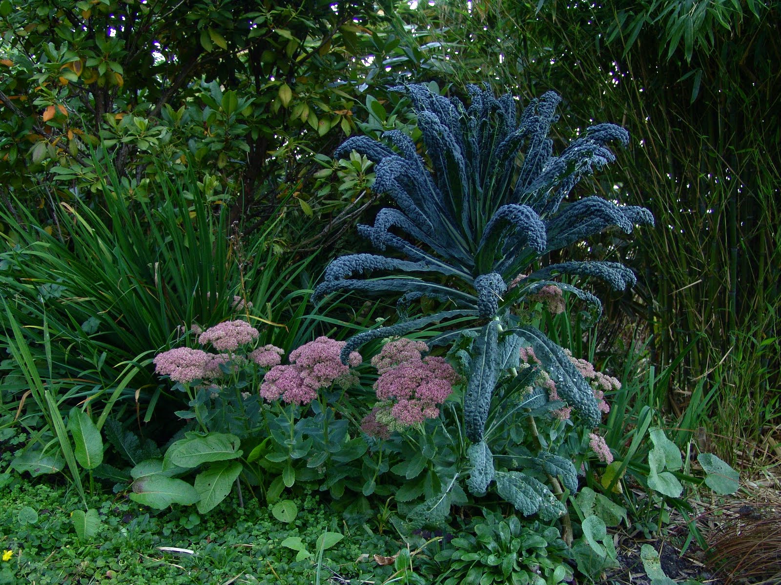 This view of Tahoma, wearing one of her lovely hats, distracted me from the garden on a recent evening. I’d been photographing the sedum blooms ripening from a rich pink toward their autumnal bronze coloration under a Lacinata kale in the lowering light.